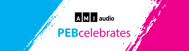 A banner with brush stroke style colours on either side (blue and pink) frames the AMI-audio logo and the words "PEB Celebrates"